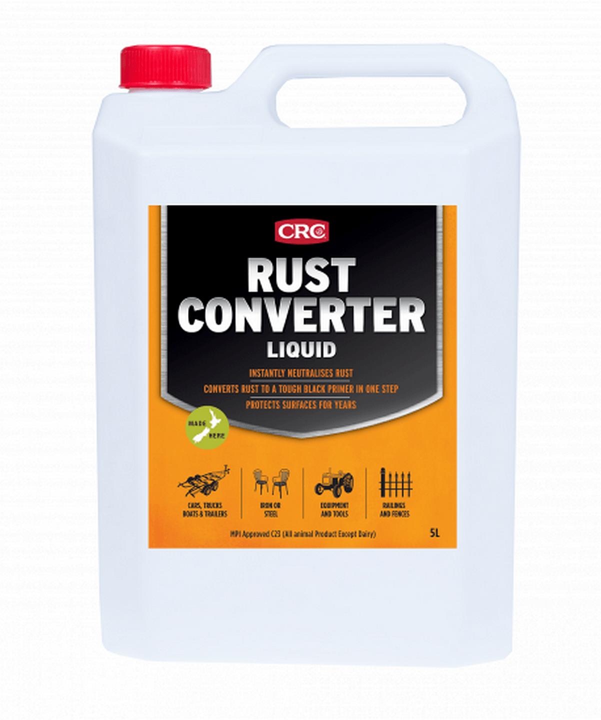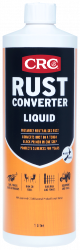 CRC Rust Converter is a unique fast drying coating formulated for treatment of lightly rusted or correctly prepared metal surfaces. CRC Rust Converter neutralise rust and converts it to a tough black primer in one easy step. It binds to the surface and provides a waterproof barrier by sealing out moisture and other outside elements for effective long-lasting rust protection. No more sandblasting, heavy scraping, or grinding.