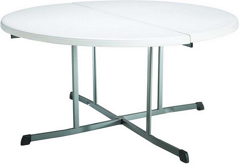Lifetime 60-Inch Round Commercial Fold-In-Half Table - Features a 60 in. round molded tabletop (white granite) with a round folding frame (gray). 10-year limited warranty.